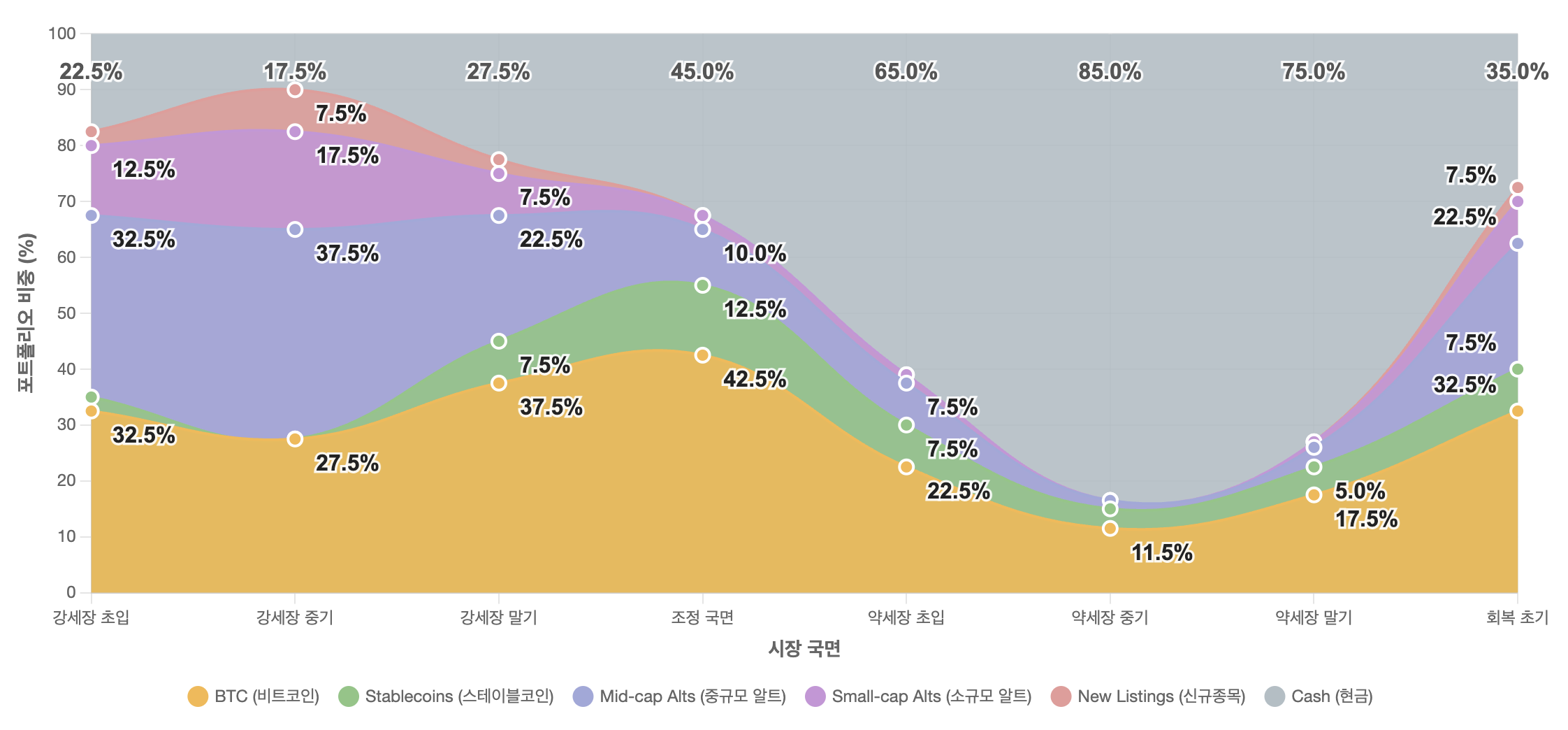암호화폐 시장은 뚜렷한 사이클을 가지고 있으며, 각 국면마다 최적의 포트폴리오 구성 전략이 다릅니다.