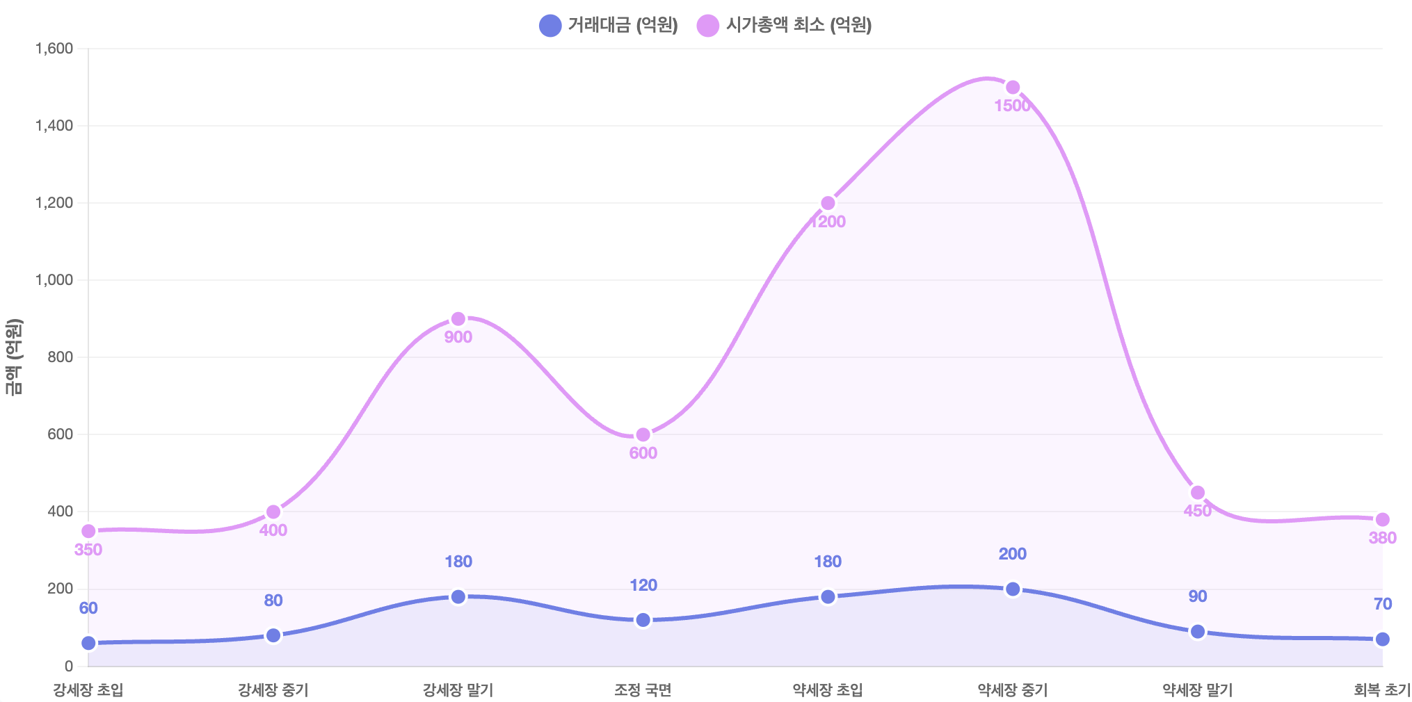 시장 국면에 따라 거래대금과 시가총액 기준이 어떻게 변화하는지 보여줍니다. 약세장에서는 안정성을 위해 기준을 높이고, 강세장에서는 기회 포착을 위해 기준을 낮춥니다.