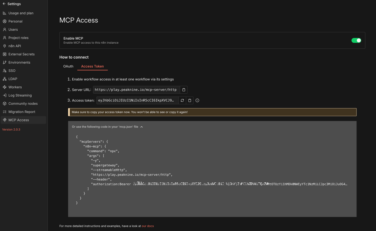 - 설정된 워크플로우는 MCP Access 화면 하단의 Available Workflows 목록에 표시됩니다
